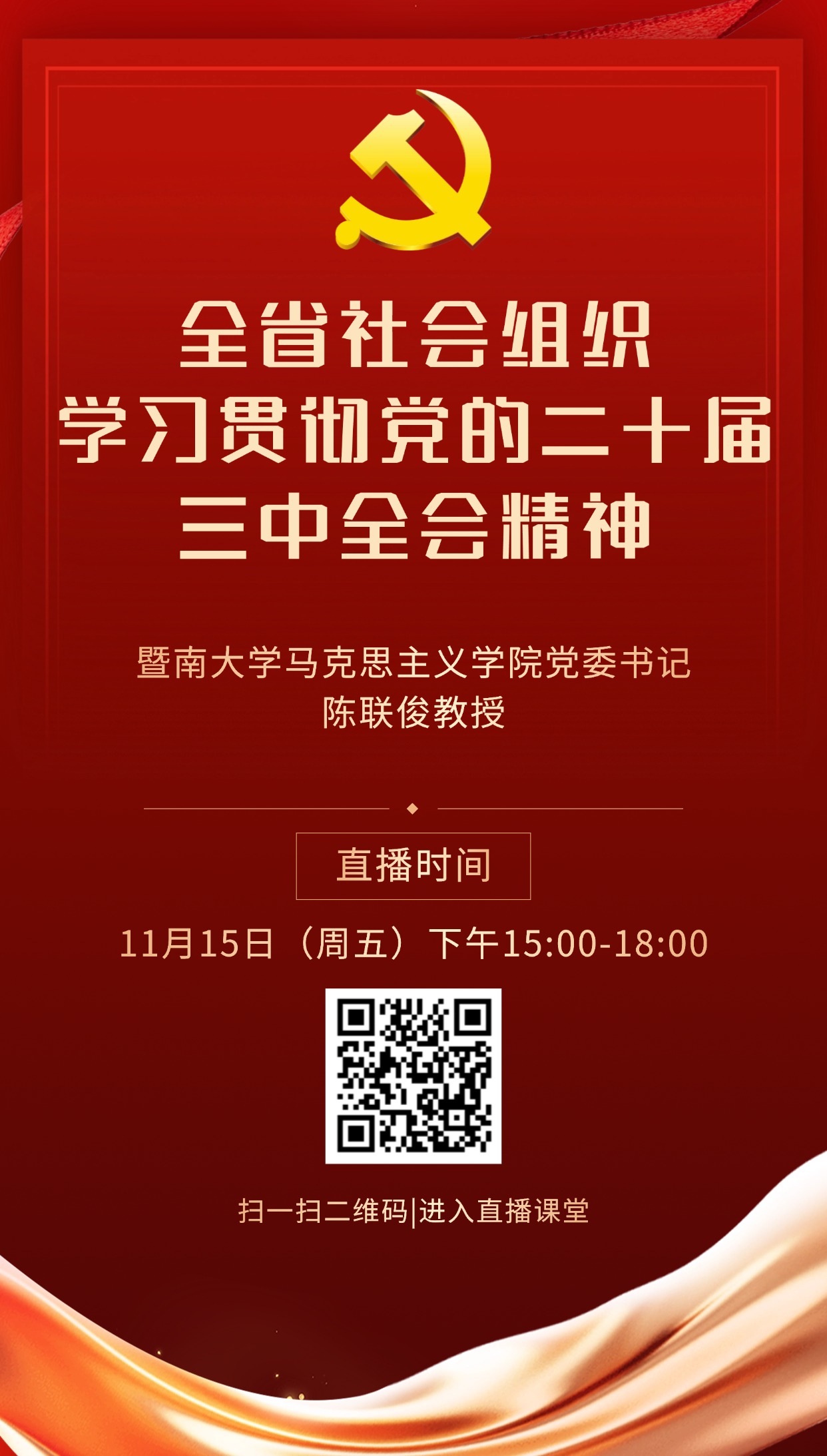 为进一步深入学习贯彻党的二十届三中全会精神,广东省社会组织管理局现组织开展党的二十届三中全会精神宣讲活动,宣讲采取线上直播方式进行,请各社会组织积极组织观看,现就有关事项通知如下: